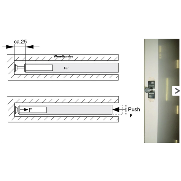 To close the door, just press lightly against its edge and the integrated spring will push the door out of the wall pocket so far that the handle is accessible again