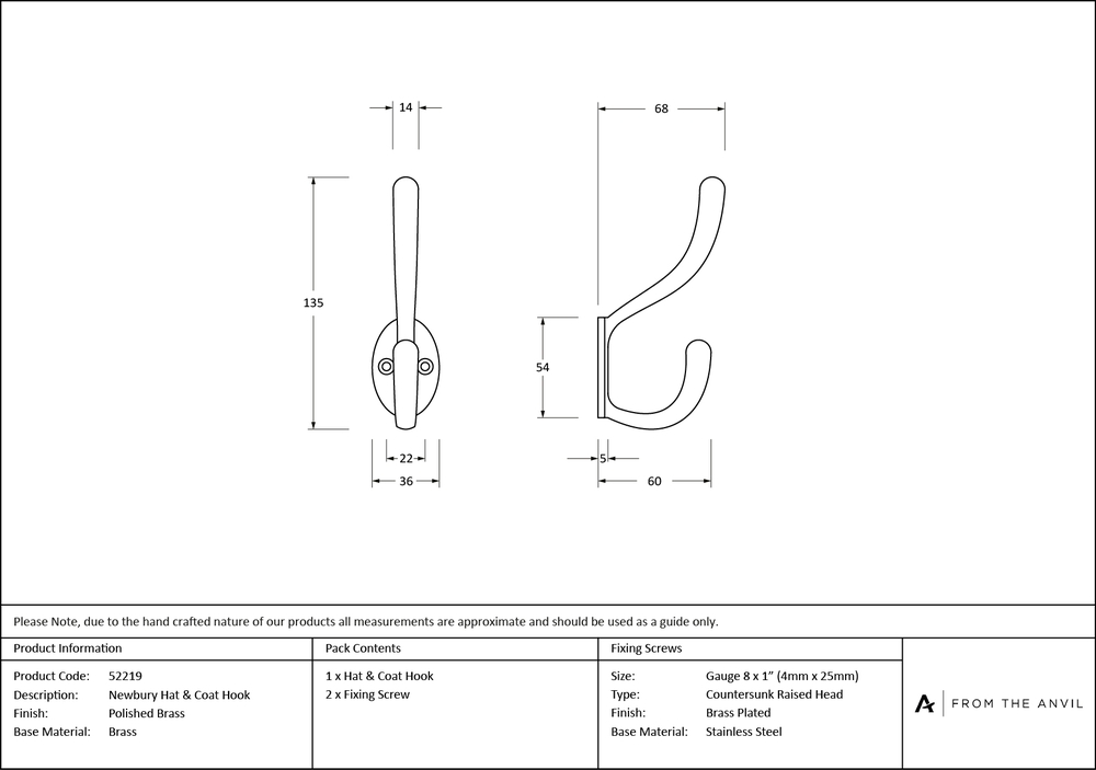 Our large and varied collection of hooks add character and charm to any project or property. An accessory that's both purposeful and decorative. Our hat & coat hook is forged from solid brass which emphasises the high quality materials and manufacturing techniques used. A perfect design choice for internal doors with many matching products available. Can be used as a single item or grouped together with different styles to create a feature. Match with any products from our best-selling Newbury range for a timeless and cohesive look throughout your home. Supplied with matching SS wood screws.