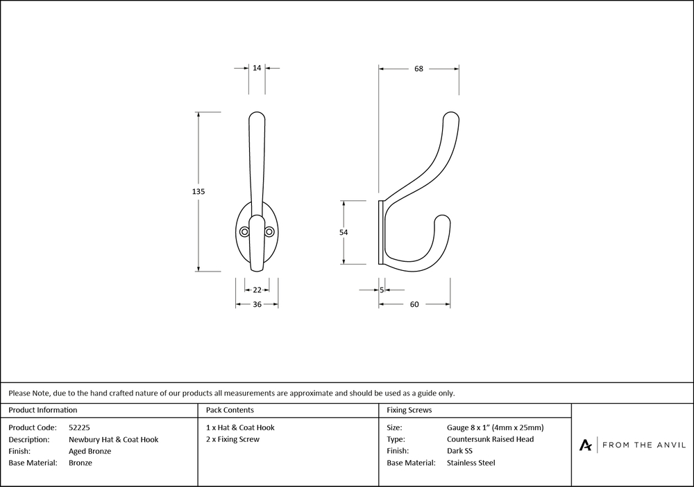 Our large and varied collection of hooks add character and charm to any project or property. An accessory that's both purposeful and decorative. Our hat & coat hook is forged from solid bronze which emphasises the high quality materials and manufacturing techniques used. A perfect design choice for internal doors with many matching products available. Can be used as a single item or grouped together with different styles to create a feature. Match with any products from our best-selling Newbury range for a timeless and cohesive look throughout your home. Supplied with matching SS wood screws.