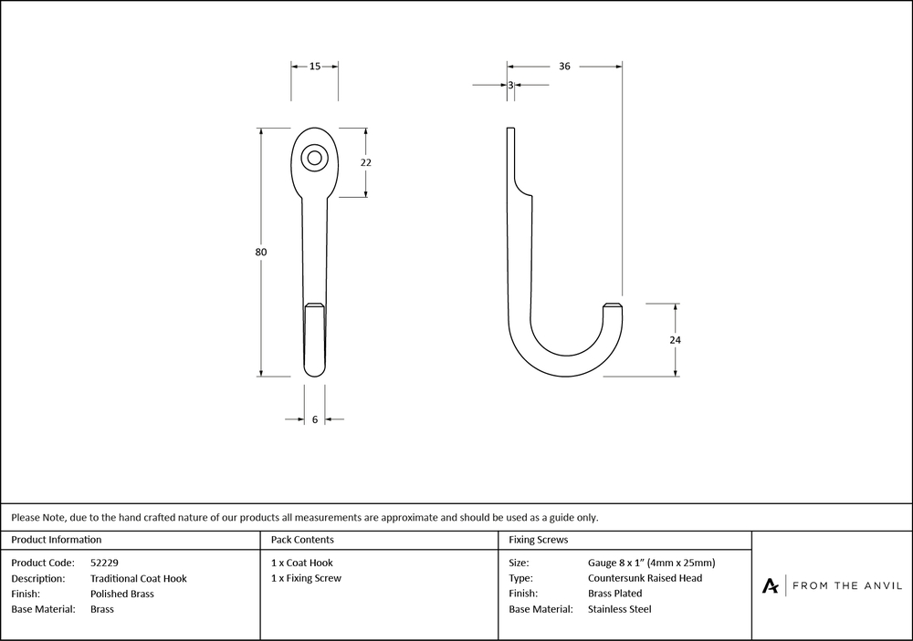 Our large and varied collection of hooks add character and charm to any project or property. An accessory that's both purposeful and decorative. A simplistic design which complements a variety of other products within our collection of door, window and cabinet furniture. Our traditional coat hook is forged from solid brass which emphasises the high quality materials and manufacturing techniques used. A perfect design choice with many matching products available. Can be used as a single item or grouped together with different styles to create a feature. Available in a range of our best selling finishes to enable cohesion when paired with other products from our range. Supplied with matching SS wood screw.