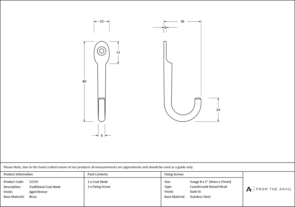 Our large and varied collection of hooks add character and charm to any project or property. An accessory that's both purposeful and decorative. A simplistic design which complements a variety of other products within our collection of door, window and cabinet furniture. Our traditional coat hook is forged from solid bronze which emphasises the high quality materials and manufacturing techniques used. A perfect design choice with many matching products available. Can be used as a single item or grouped together with different styles to create a feature. Available in a range of our best selling finishes to enable cohesion when paired with other products from our range. Supplied with matching SS wood screw.