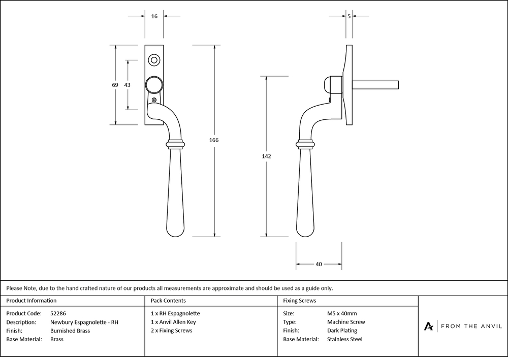 The Newbury range is sleek and elegant, with a slender design that suits a variety of property types. Our weighty range of Newbury window furniture is hand forged from solid brass to create a product that's as beautiful as it is hardwearing. A perfect design choice to use throughout your property with many matching products available. Due to their slim fixing plates, our espagnolettes can be fitted on any type of window including uPVC and timber. Designed to match the products in our Newbury range. The product is handed and therefore care needs to be taken when choosing the correct hand. From the inside view, if your window is hinged on the right then a right-hand fastener is required. They have a 7mm² x 40mm spindle and can be locked by way of a grub screw. Suitable for use with an espagnolette gearbox and window lock. Supplied with matching SS M5 screws.
