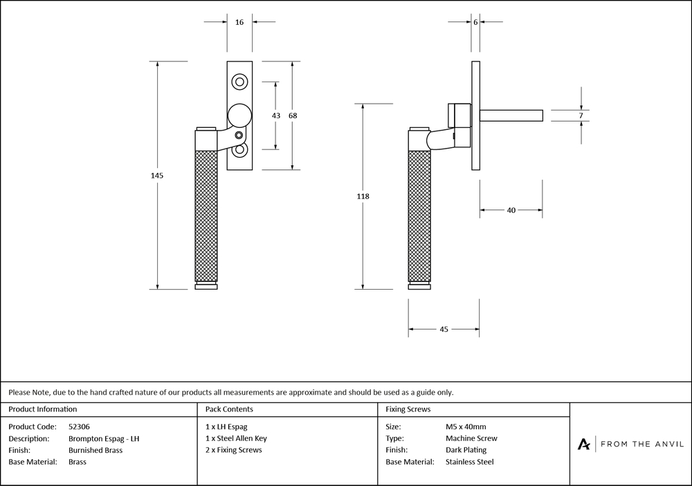 The contemporary Brompton suite features a textured, knurled surface. The industrial styling of the diamond pattern creates a modern range of products that can be used consistently throughout a property. Our Brompton window furniture is hand forged from solid brass to create a product that's as beautiful as it is hardwearing. A perfect design choice to use throughout your property with many matching products available. Due to their slim fixing plates, our espagnolettes can be fitted on any type of window including uPVC and timber. Designed to match the products in our Brompton range. The product is handed and therefore care needs to be taken when choosing the correct hand. From the inside view, if your window is hinged on the left then a left-hand fastener is required. They have a 7mm² x 40mm spindle and can be locked by way of a grub screw. Suitable for use with an espagnolette gearbox and window lock. Supplied with matching SS M5 screws.