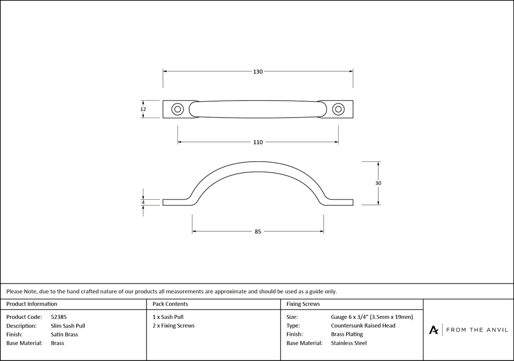 Overall Size : 130 x 12mm Internal Size : 85mm Fixing Centres : 110mm Projection : 30mm