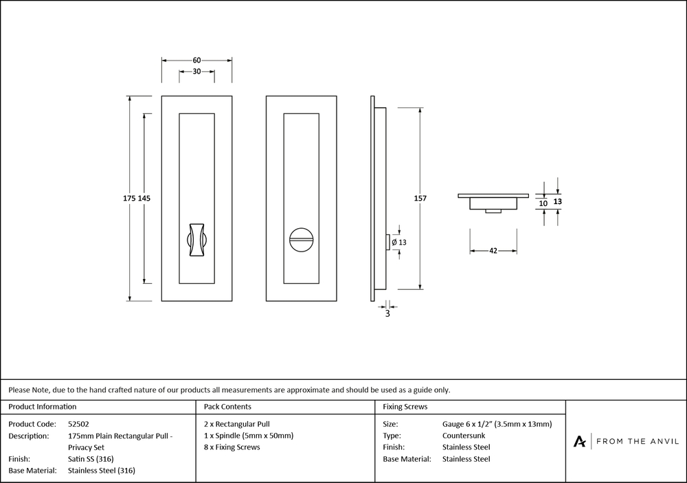 Our range of sliding door furniture is suitable for all sliding, pocket, and flush door systems. The Plain design matches a number of other products in the range. Maximum door thickness: 45mm. Longer thumbturn spindles available on request. Minimum door thickness: 35mm. Set includes 2 Rectangular pull handles and coin and release thumbturn. Can be used with a sliding door lock. Available in two sizes. Supplied with matching SS wood screws.