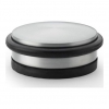 It is a solid brass door stop in a fresh and contemporary satin chrome finish, with a rubber ring around the circumference to cushion the door and a rubber base to help stop it from slipping.