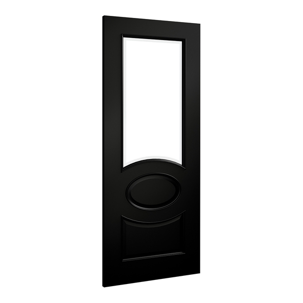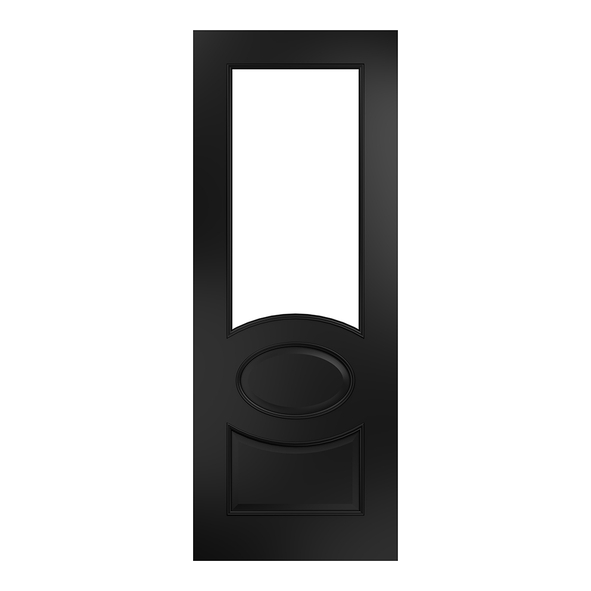 The Deanta Clarendon prefinished black internal door features Victorian-inspired detailing with a modern black finish. Its distinctive triple-panel layout includes a small lower panel, a central oval panel, and a larger upper panel fitted with glass. This allows natural light to flow between rooms. The smooth black surface ensures a flawless, ready-to-fit finish.