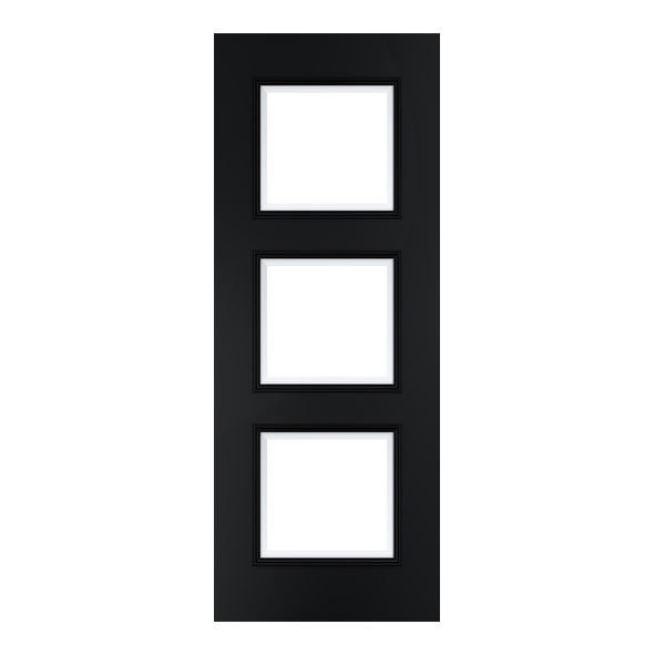 The Deanta Trinity Prefinished Black internal door with glass combines contemporary styling with functional design. Its three vertical square panels are fitted with clear glass, allowing light to pass through interiors while maintaining privacy. The sleek black finish enhances the precision of the triple-square layout.