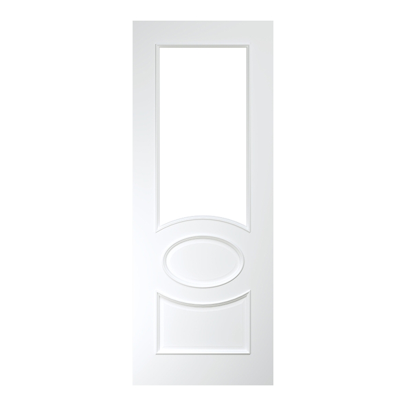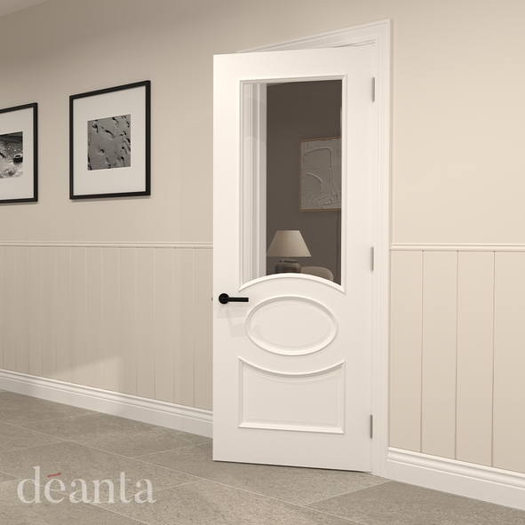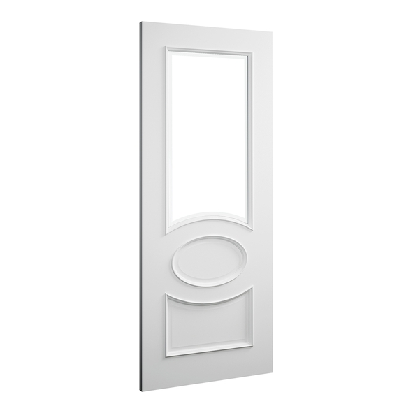 The Deanta Clarendon White Primed internal door features Victorian-inspired detailing and a smooth primed finish. Its distinctive triple-panel layout includes a small lower panel, a central oval panel, and a larger upper panel fitted with clear glass, allowing natural light to flow between rooms while maintaining privacy.