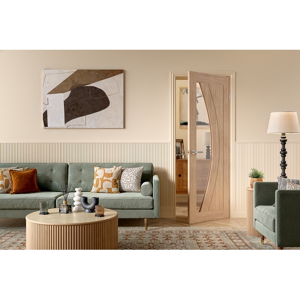 Description : Add natural warmth and contemporary style to your home with the Girona Internal Pre-Finished Oak Clear Glazed Door. Showcasing a sleek modern design with two elegant curved grooves and a large pane of clear glazing, this door allows light to flow effortlessly between rooms, creating a bright and spacious atmosphere. Expertly finished in a high-quality pre-finished oak veneer, the Girona comes ready to hang. Its smooth surface enhances the natural beauty of the oak, while providing long-lasting protection and a premium feel. Built with a solid engineered core, this door offers exceptional strength, stability, and durability.The combination of clear glazing and contemporary detailing gives it a refined, designer look that complements a wide range of interior styles.