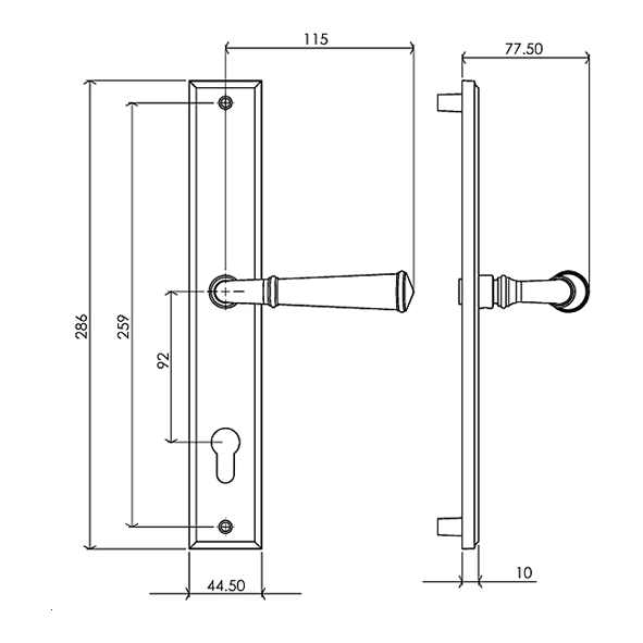 Dimensions : Cylinder Centres 92mm • Backplate 286 x 44.5mm • Lever Length 115mm • Projection 77.5mm • Weight 1.36kg