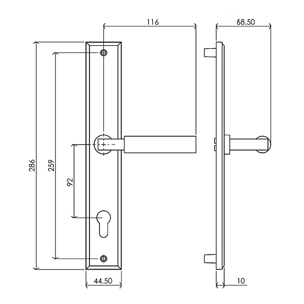 Dimensions : Cylinder Centres 92mm Backplate 286 x 44.5mm Lever Length 116mm Projection 68.5mm Weight 1.63kg