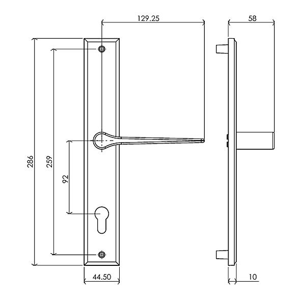 Dimensions : Cylinder Centres 92mm Backplate 286 x 44.5mm Lever Length 129mm Projection 58mm Weight 1.36kg