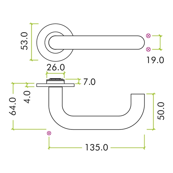 Dimensions : 53mm Ø x 4mm push on rose • Suitable for 35 to 54mm thick doors