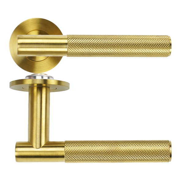RT060-SLIM-PVDSB • PVD Satin Brass • Rosso Tecnica Orta Levers On Slim Round Roses
