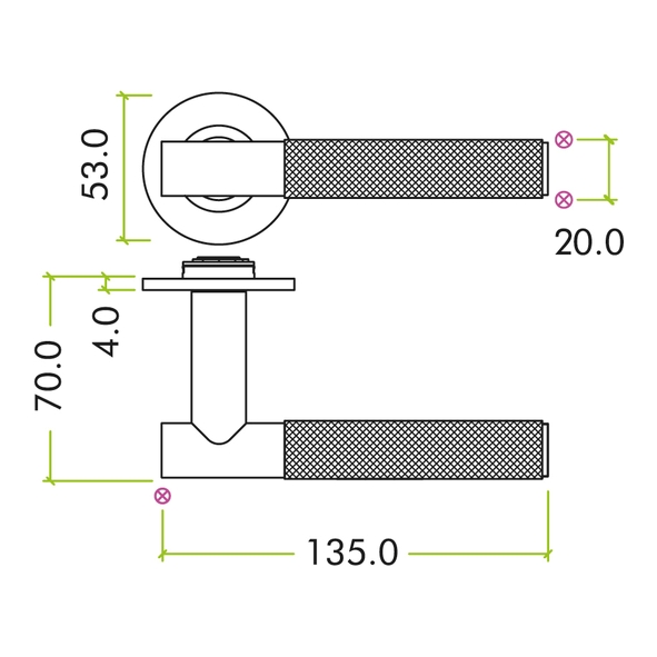 Dimensions : 53mm Ø x 4mm push on rose • Suitable for 35 to 54mm thick doors