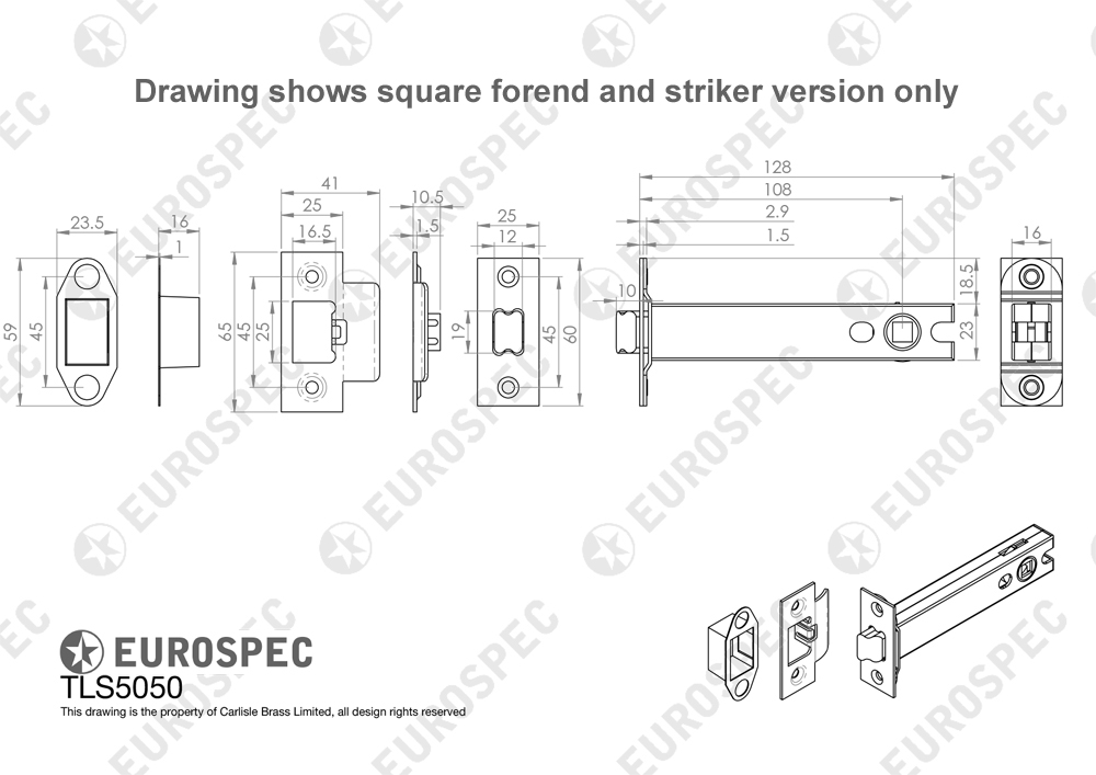 Dimensions : Backset 108mm • Case Depth 128mm • Case height 23mm • Case width 16mm • Forend length 60mm • Forend Width 25mm