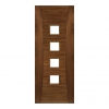 The contrasting orientation shows off the grain pattern to its best advantage, and the contrast is strikingly accentuated by the gentle curves of the vertical veneers, which carve a subtle waist into the horizontals. In the glazed door, four square panes of clear toughened glass are set neatly into the panels