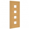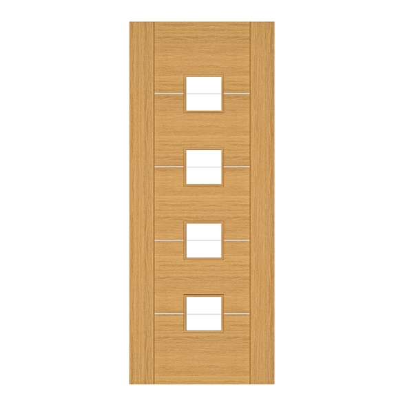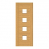 A flawless blend of nature's charm and industrial elegance. Crafted with precision, this door features horizontal panels of crown-cut oak veneer, showcasing the inherent beauty of the grains. Enhanced with sleek aluminium inlays, it adds a touch of modern sophistication to any interior. In the glazed door, four square panes of clear glass feature a bevelled centre, are set between the panels