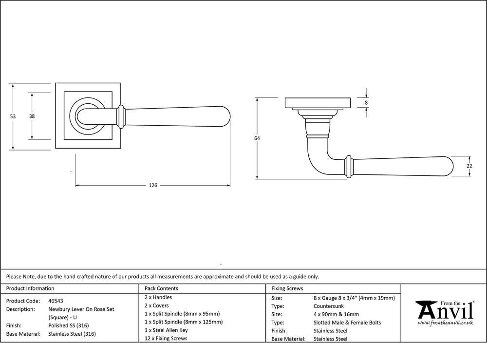 The Newbury range is sleek and elegant, with a slender design that suits a variety of property types. Our weighty Newbury lever handle range is forged from marine ss (316) which emphasises the high quality materials and manufacturing techniques used. A perfect design choice to use throughout your property with many matching products available. This concealed lever handle features a simple Square rose which adds a contemporary edge to a traditional looking product. The handle is unsprung and is available on a 2 week lead time. Lever handle for internal and external doors where locking is either required or not required. Set includes 2 concealed lever on rose handles. Can be used with a multitude of standard locks, Euro locks, latches, escutcheons & thumbturns for various uses within the home. Supplied with matching SS bolt through fixings & SS wood screws.