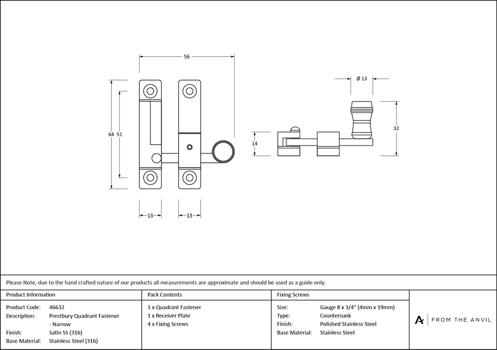 Our collection of sash furniture complements all other products within the range, allowing a consistent finish throughout a property or project. Designed to match the Prestbury door and cabinet furniture in the range. A stylish quadrant fastener used to secure your sash window. Ideal for use on a narrow top rail due to a thin fixing keep. The fastener has a locking mechanism by way of a grub screw. Sold in singles. Supplied with matching SS wood screws.