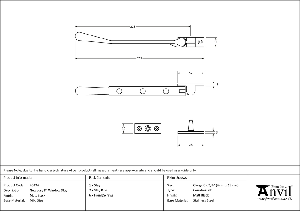 Overall Length : 249mm Stay Arm : 228mm Fixing Plate : 57 x 16mm