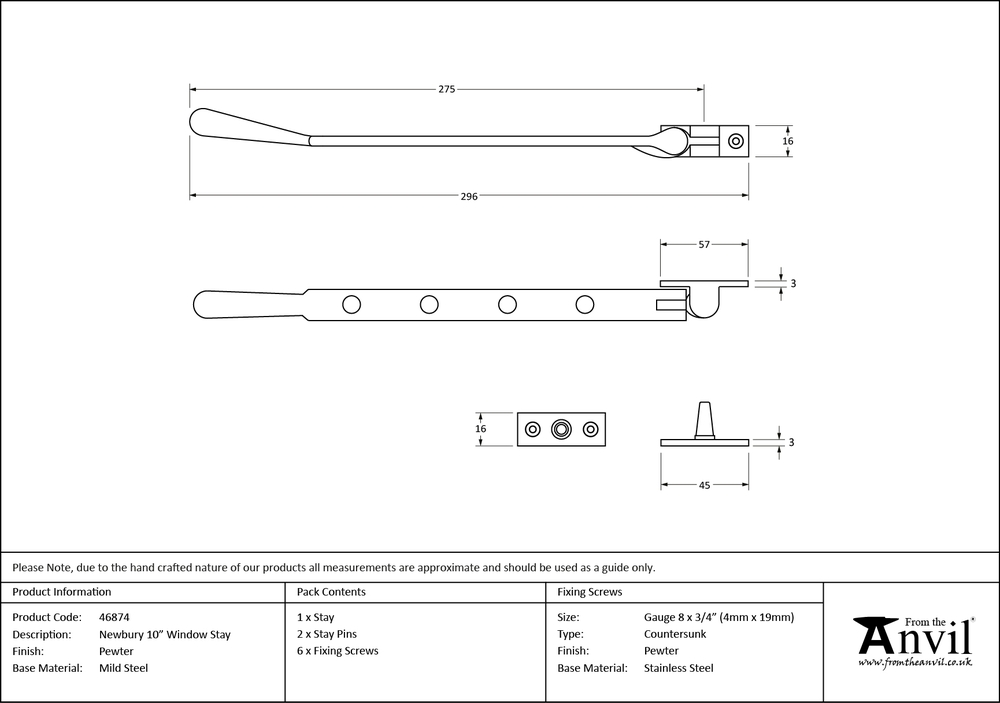 Overall Length : 296mm Stay Arm : 275mm Fixing Plate : 57 x 16mm