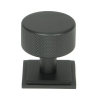 This cabinet knob features a simple square rose which adds an angular contrast to the round knob.