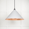 Our Hammered Copper pendants are spun from solid copper. When lit, this finish creates a soft, dappled light with a warm glow, best balanced with a cooler/brighter bulb.