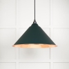 Our Hammered Copper pendants are spun from solid copper. When lit, this finish creates a soft, dappled light with a warm glow, best balanced with a cooler/brighter bulb.