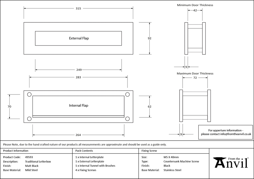 Our door letterbox is supplied as a full kit and contains a tunnel and brushes to reduce draughts and insulate the door. The inner sleeve also protects the door from moisture and helps to mask the aperture cutting. We recommend our door letterbox for composite and uPVC doors. Combine with our matching Matt Black door furniture to create a feature entrance. Maximum door thickness: 72mm. Minimum door thickness: 42mm. Supplied with matching SS bolt through fixings.