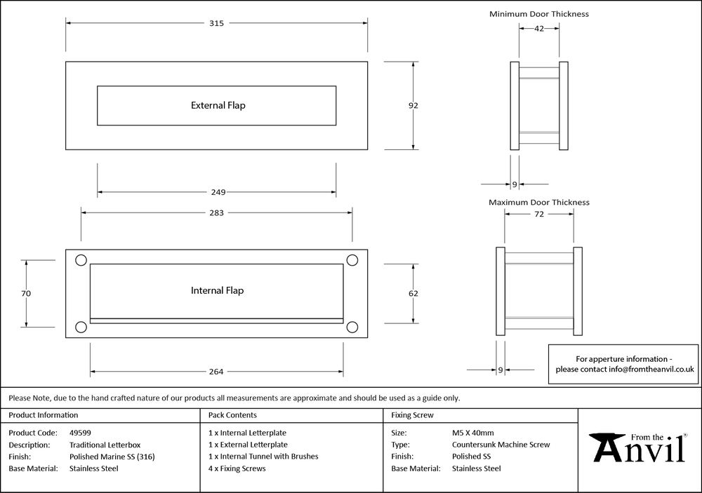 For composite and upvc doors we would recommend using our door letterbox which is supplied as a full kit and contains a tunnel and brushes to reduce drafts and insulate the door. The sleeve inside the letterbox also protects the door from moisture and masks the aperture cutting. Designed to match our other polished marine SS front door furniture to create a feature entrance door. Maximum door thickness: 72mm. Minimum door thickness: 42mm. Supplied with matching SS bolt through fixings.