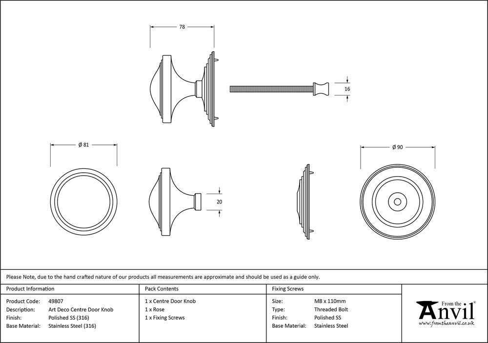 Our elegant collection of centre door knobs suit all applications from a country cottage, town house or high street shop. Our Art Deco range is forged from marine ss (316) which emphasises the high quality materials and manufacturing techniques used. A perfect design choice for external doors with matching products available. Designed to match our Art Deco door knocker to create a uniform feeling on your front door. Our centre door knobs also include a location pin on the rose to stop any unwanted movement during the life of your product. Supplied with M8 x 110mm stainless steel threaded bolt for bolt-through fixing.