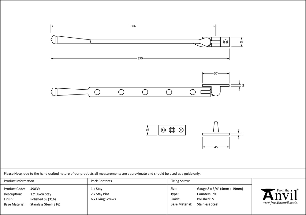 Overall Length : 330mm Stay Arm : 306mm Fixing Plate : 57 x 16mm