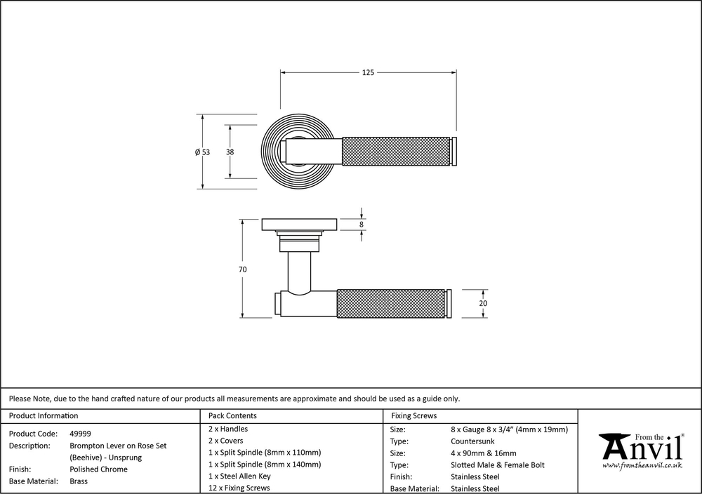 The contemporary Brompton suite features a textured, knurled surface. The industrial styling of the diamond pattern creates a modern range of products that can be used consistently throughout a property. Designed to match the products in our Brompton range. This concealed lever handle features a decorative Beehive rose which matches a number of other products in our range and adds a contemporary edge to a traditional looking product. The handle is unsprung and is available on a 2 week lead time. Lever handle for internal and external doors where locking is either required or not required. Set includes two concealed lever on rose handles. Suitable for use with a multitude of standard locks, Euro locks, latches, escutcheons, and thumbturns for various purposes. Supplied with matching SS bolt through fixings & SS wood screws.