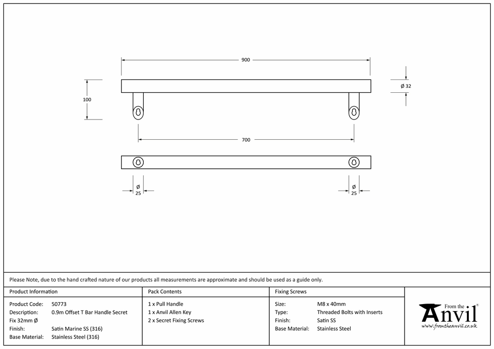 Our stylish T-bar pull handles have a modern, simplistic design and are perfect for use on entrance doors. Manufactured from Marine Grade 316 Stainless Steel, these pull handles offer unrivalled corrosion resistance. This secret fix option allows the pull handle to be fitted with no visible bolt on the inside of your door. Available in five sizes. Supplied with matching SS bolts.