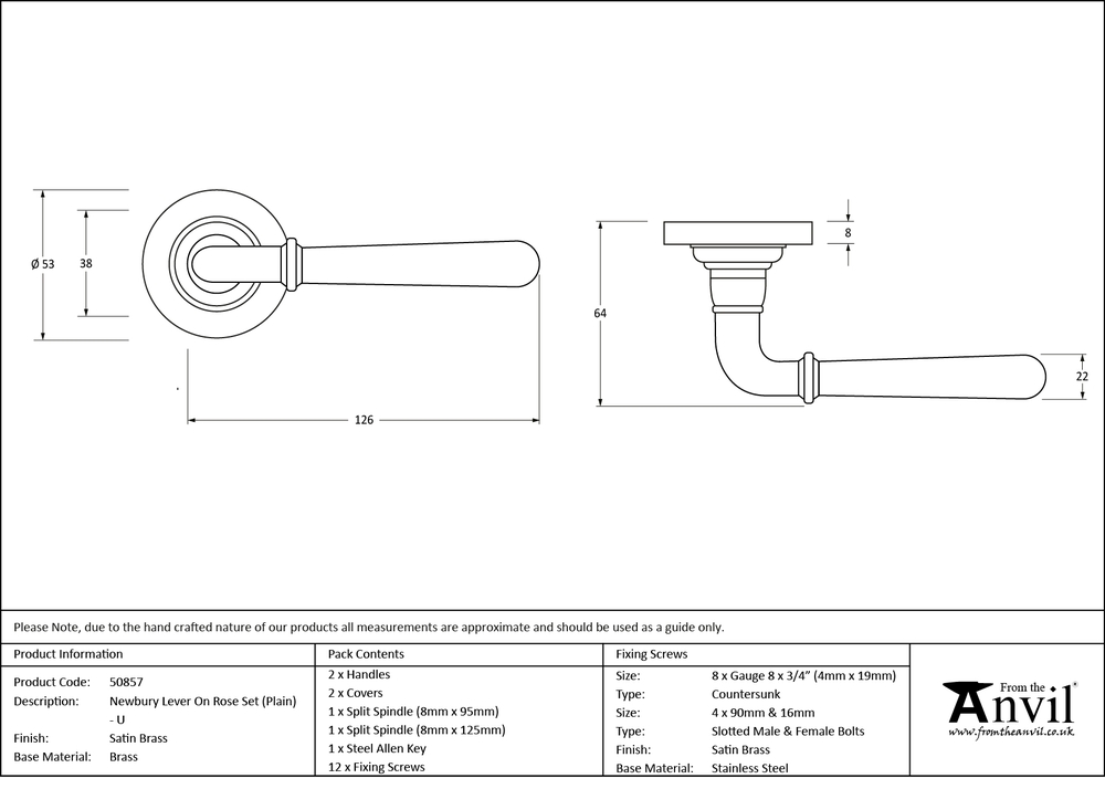 50857 • 53 x 8mm • Satin Brass • From The Anvil Newbury Lever on Rose [Plain] - Unsprung