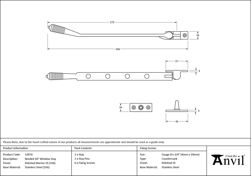 Overall Length : 296mm Stay Arm : 275mm Fixing Plate : 45 x 16mm