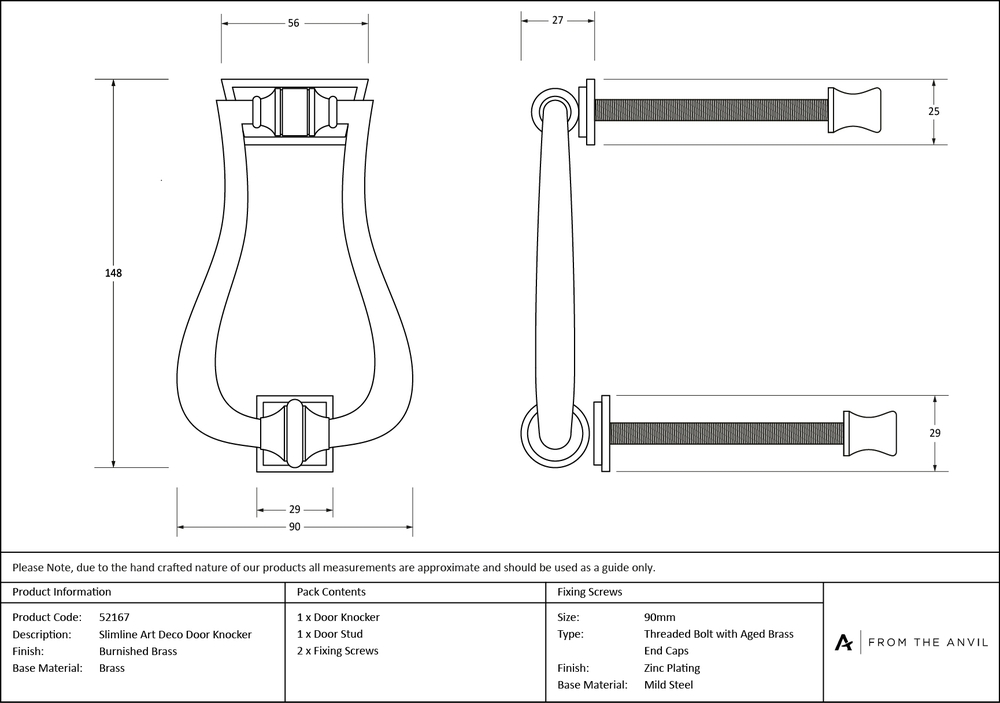 Our extensive selection of door knockers are designed to suit a variety of doors including timber, composite, uPVC, and aluminium, offering both traditional and contemporary designs. Our Art Deco door knocker is forged from solid brass which highlights all the hand finished details of its design. A perfect choice for external doors, with many matching products available. Coordinate with our matching Art Deco centre door knob for a truly grand entrance. Fixes to your door using a bolt-through fixing for the knocker and strike plate which is fitted with a dome head cap on the internal side of the door. Supplied with matching 110mm stainless steel threaded bolts which provide a bolt-through fixing.