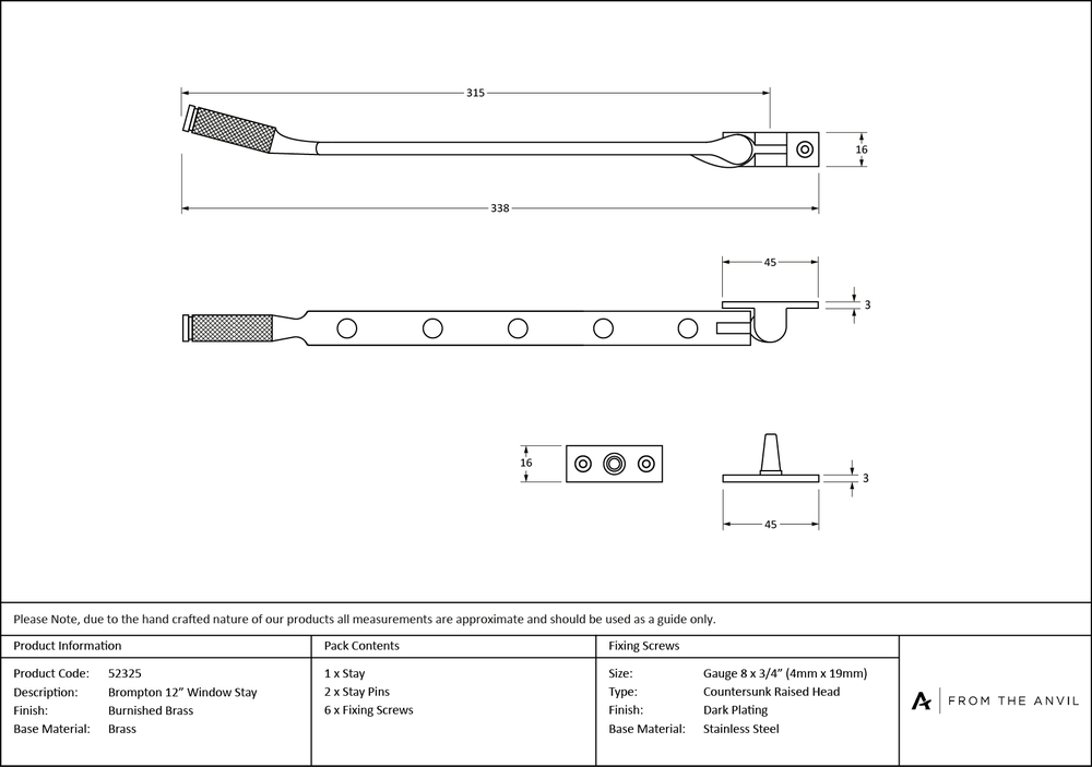 Overall Length : 338mm Stay arm : 315mm Fixing Plate : 45 x 16mm