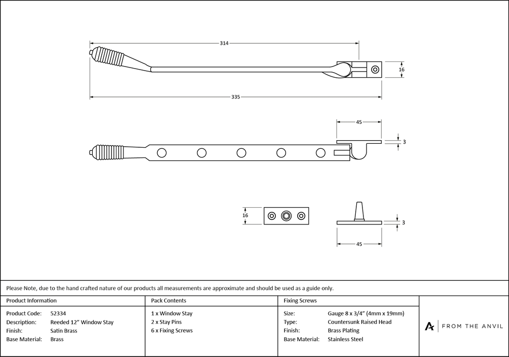 Overall Length : 335mm Stay Arm : 314mm Fixing Plate : 45 x 16mm
