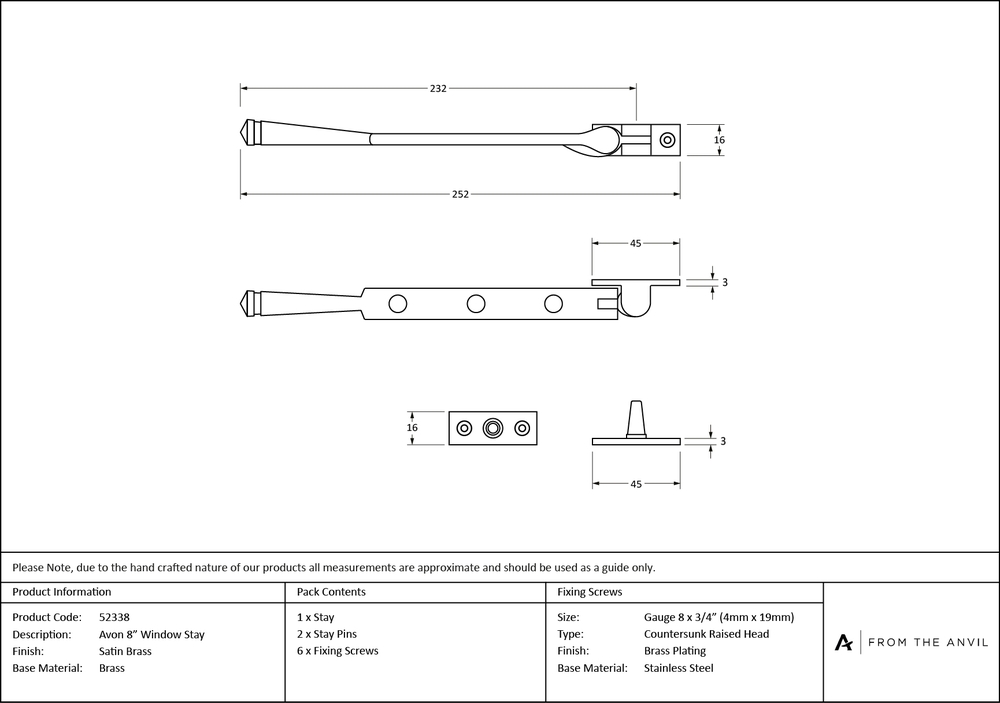 Overall Length : 252mm Stay Arm : 232mm Fixing Plate : 45 x 16mm