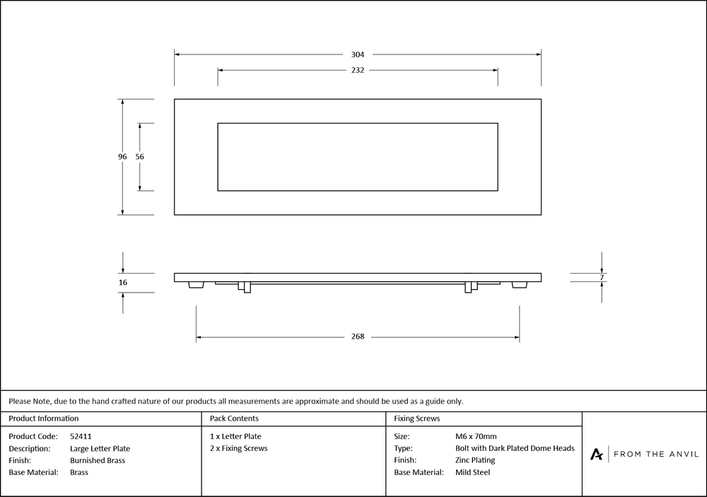 Overall Size : 304 x 96mm Opening Size : 232 x 56mm Fixing Centres : 268mm Letterplate Thickness : 7mm