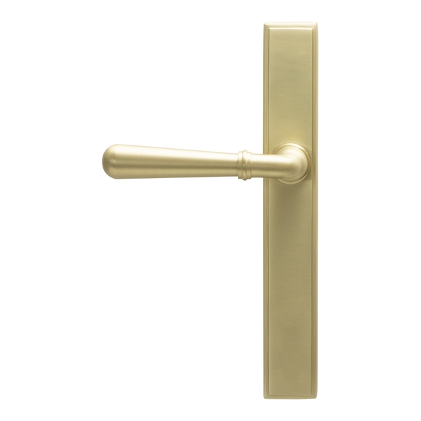 The Newbury range is sleek and elegant, with a slender design that suits a variety of property types. Our weighty Newbury lever handle range is hand forged from solid brass to create a product that's as beautiful as it is hardwearing. This handle has a strong double spring incorporated into its stylish boss design which provides both elegance and practicality. Lever handle for external doors where multi-point locking is not required, generally fitted to the slave door on French doors. Set includes an internal and external slimline lever latch handle. Suitable for use with a French door kit in conjunction with a slimline lever espag. lock set and Euro cylinder. Supplied with matching SS bolt through fixings.