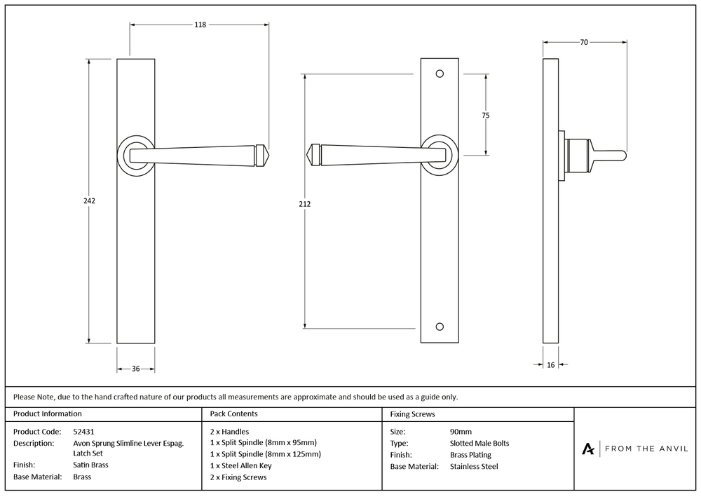 Our Avon lever handles are From The Anvil's signature design and are loved for their timeless simplicity. Each lever is hand-hammered into shape by our expert Blacksmiths to give it a contemporary, yet individual, edge. Designed to match the products in our Avon range. This handle has a strong double spring incorporated into its stylish boss design which provides both elegance and practicality. Lever handle for external doors where multi-point locking is not required, generally fitted to the slave door on French doors. Set includes an internal and external slimline lever latch handle. Suitable for use with a French door kit in conjunction with a slimline lever espag. lock set and Euro cylinder. Supplied with matching SS bolt through fixings.