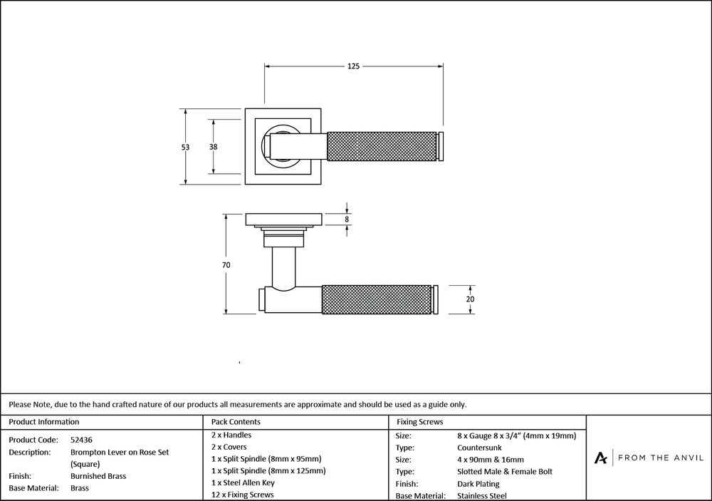 Rose Size : 53 x 53 x 8mm Handle Length : 125mm Fixing Centres : 38mm