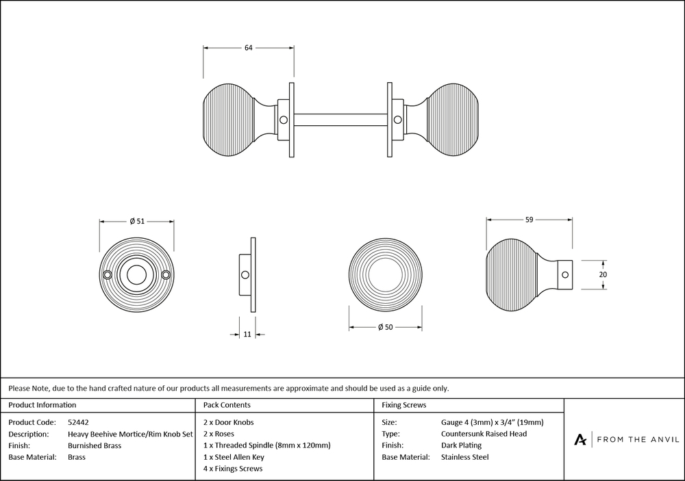 Knob Size : 50mm Dia. Projection : 64mm Rose Size : 51mm Spindle Size : 8mm Threade