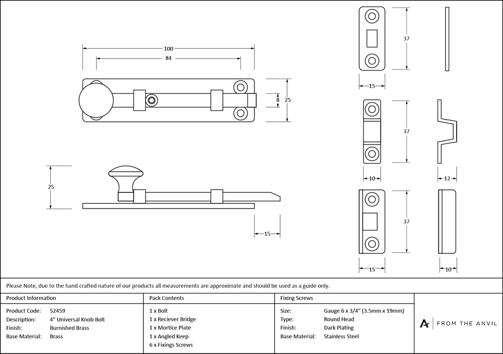 Fixing Plate : 100 x 25 x 3mm Receiver Plate : 37 x 15 x 2mm Receiver Bridge : 37 x 10 x 3mm Height : 12mm Angled Keep : 37 x 15 x 2mm Depth : 10mm Throw : 15mm