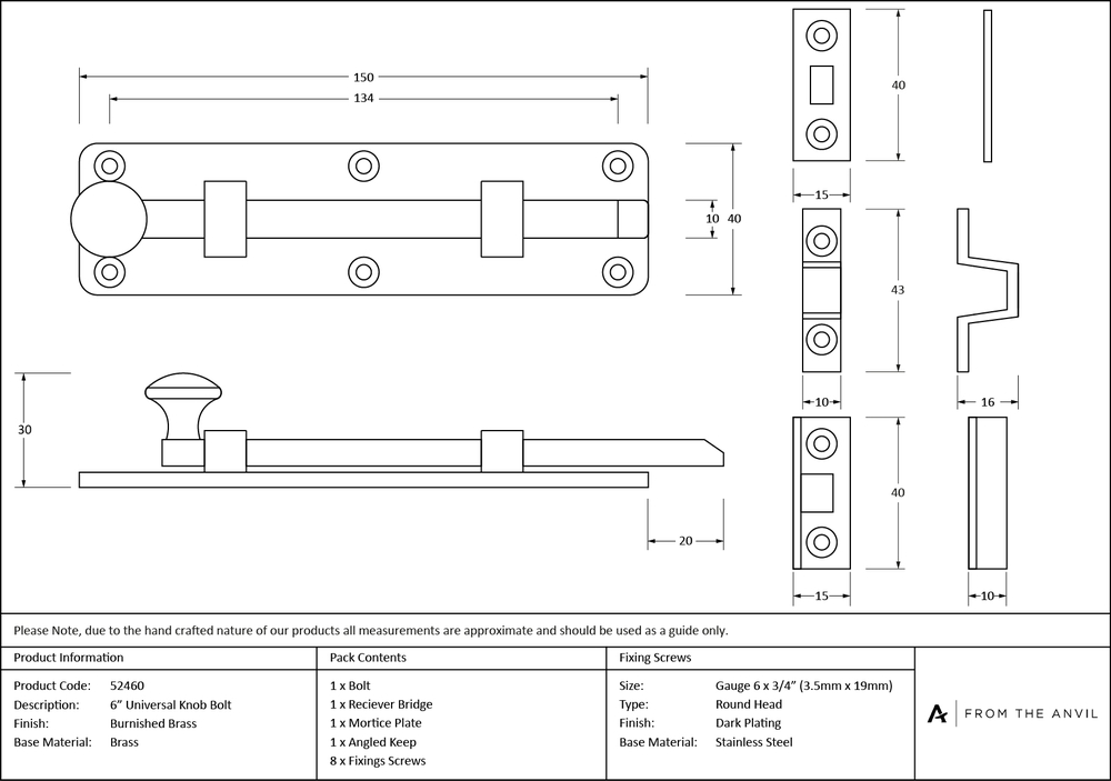 Fixing Plate : 150 x 40 x 4mm Receiver Plate : 40 x 15 x 2mm Receiver Bridge : 43 x 10 x 4mm Height : 16mm Angled Keep : 40 x 15 x 2mm Depth : 10mm Throw : 20mm
