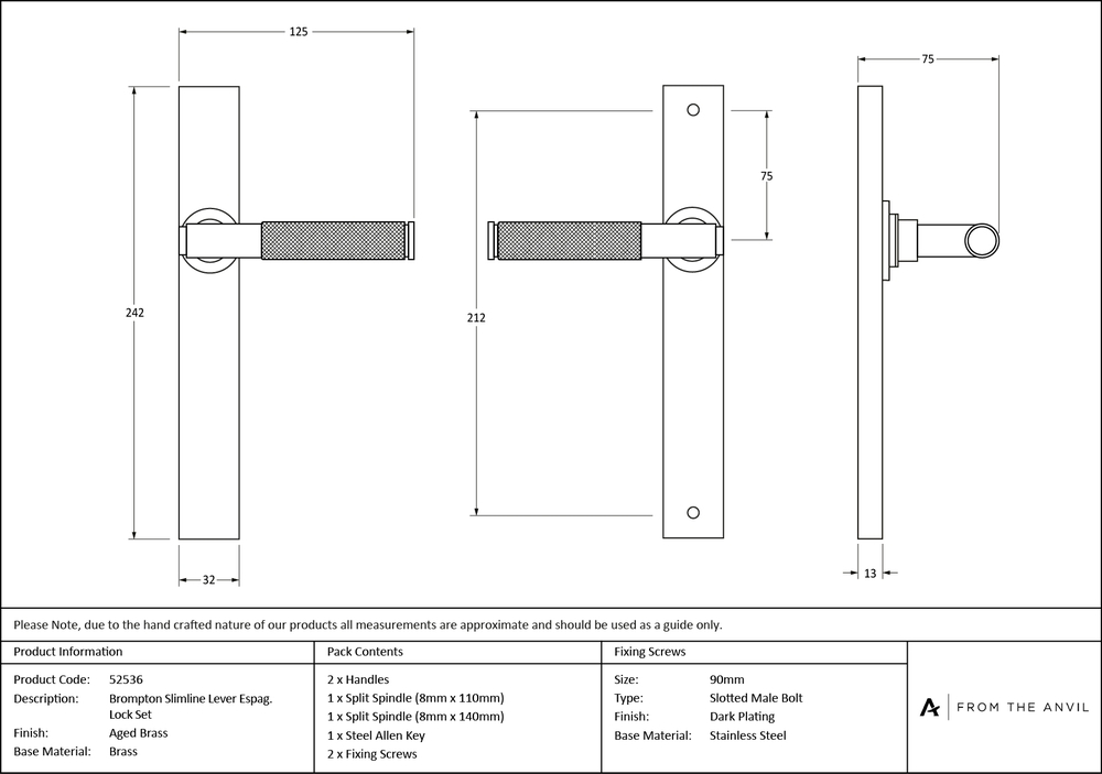 The contemporary Brompton suite features a textured, knurled surface. The industrial styling of the diamond effect creates a modern range of products that can be used throughout your property. Our Brompton lever handle range is forged from solid brass which emphasises the high quality materials and manufacturing techniques used. A perfect design choice to use throughout your property with many matching products available. This handle has a strong double spring incorporated into the stylish boss design to give both functionality & elegance. Lever handle for external doors where multi-point locking is required. Set includes an internal and external lever espag latch handle. Suitable for use with a French door kit in conjunction with a slimline lever espag. lock set and Euro cylinder. Supplied with matching SS bolt through fixings.